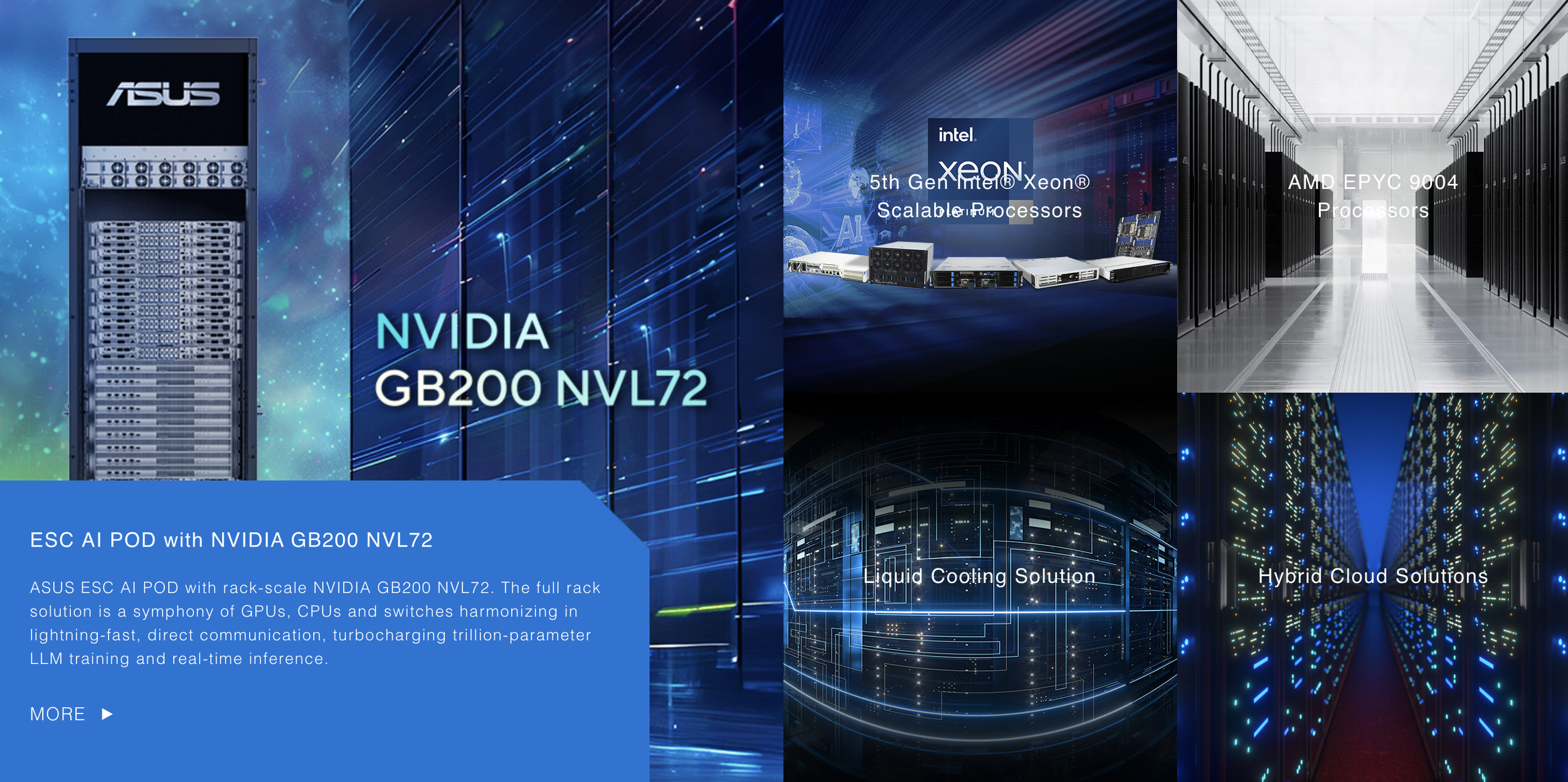 To empower the accelerated computing demands of global data centers, ASUS is revolutionizing the landscape of AI supercomputing. By integrating the 5th Gen Intel® Xeon® processors, ASUS offers a diverse array of workload-optimized servers and motherboards. With the continuous growth of AI technologies across infrastructure, software and cloud services, ASUS strives to deliver top-quality server solutions, contributing to a more sustainable future.