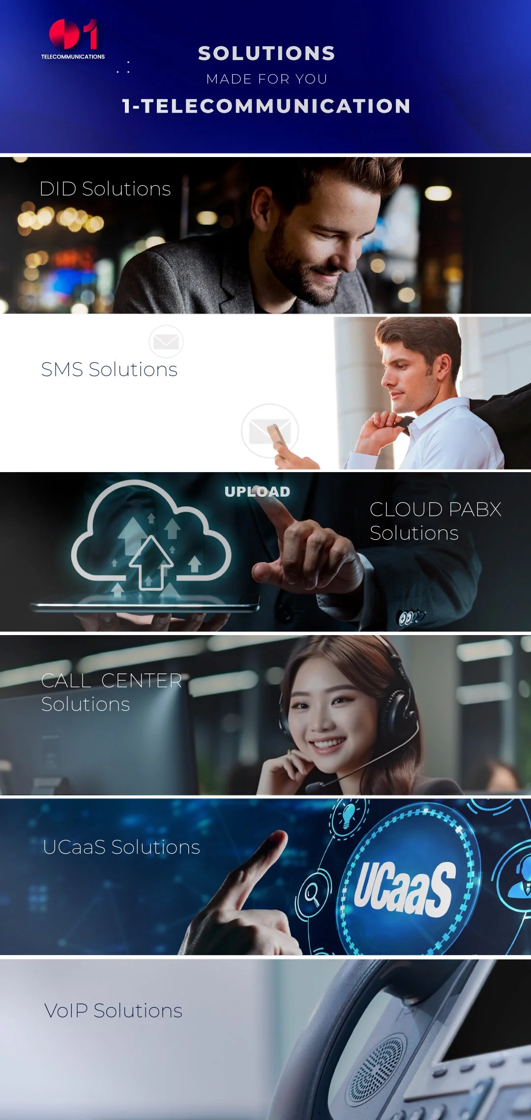 1-to-All มีความภาคภูมิใจในการเป็นศูนย์กลางการสื่อสารแบบครบวงจรสำหรับทุกความต้องการด้านการสื่อสารของคุณ เราเข้าใจดีว่าการนำทางในโลกที่ซับซ้อนของการสื่อสารโทรคมนาคมนั้นไร้ขีดจำกัด นั่นคือเหตุผลที่ผู้เชี่ยวชาญของเราทำงานอย่างใกล้ชิดกับคุณเพื่อออกแบบโซลูชั่นที่ตรงกับความต้องการขององค์กรของคุณและความปรารถนาในอนาคต ตั้งแต่ระบบเสียงแบบดั้งเดิม ไปจนถึงบริการบนระบบ Cloud ที่ทันสมัย เราพร้อมดูแลคุณ
